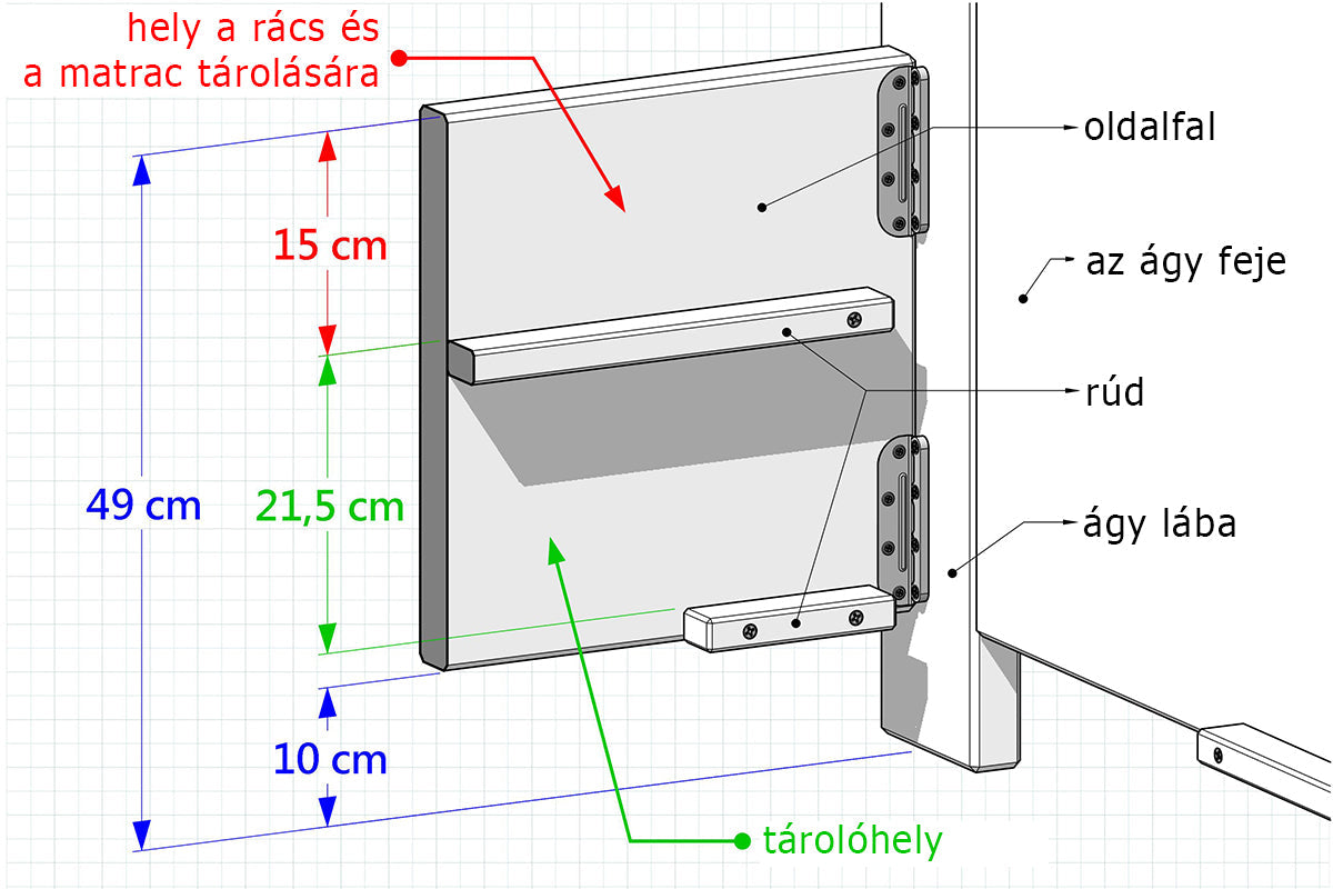 Az ágyhoz tartozik egy tárolóhely, mely a padlótól 10 cm-re van, alja pedig 1 cm vastag MDF lapból készült.