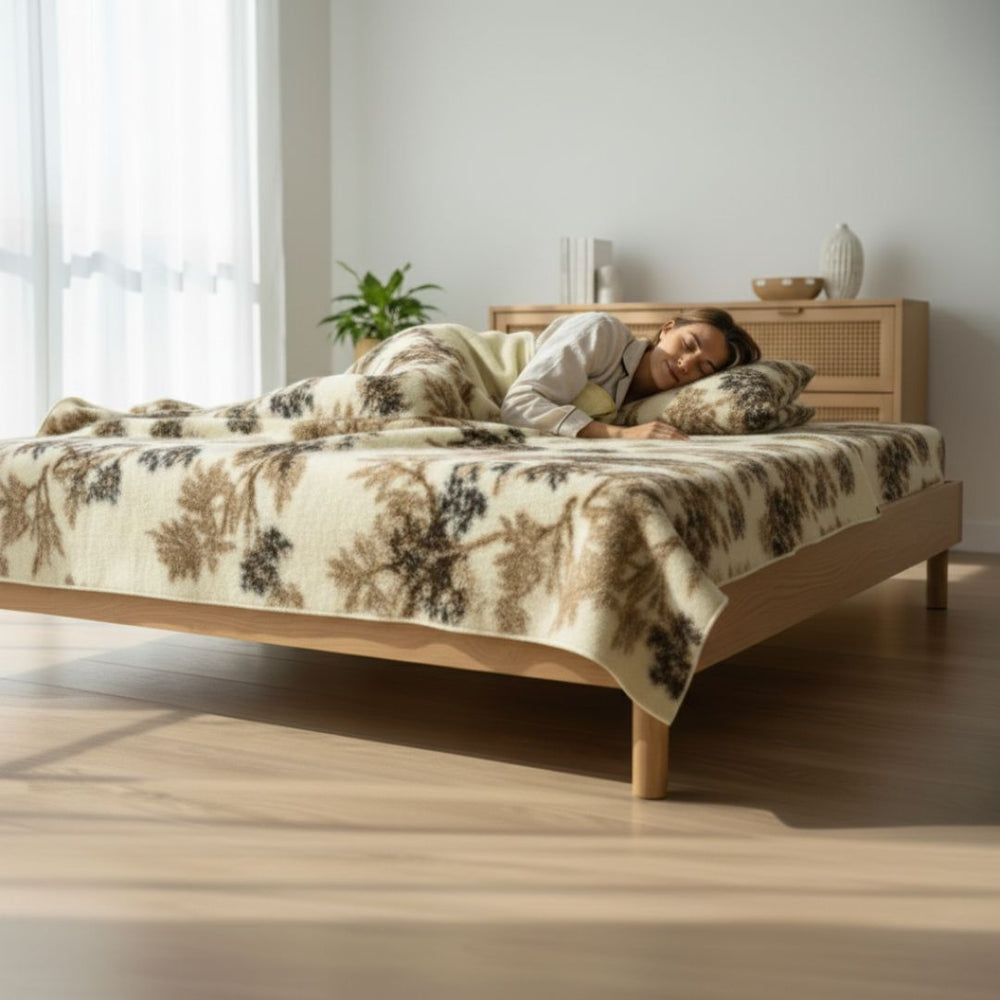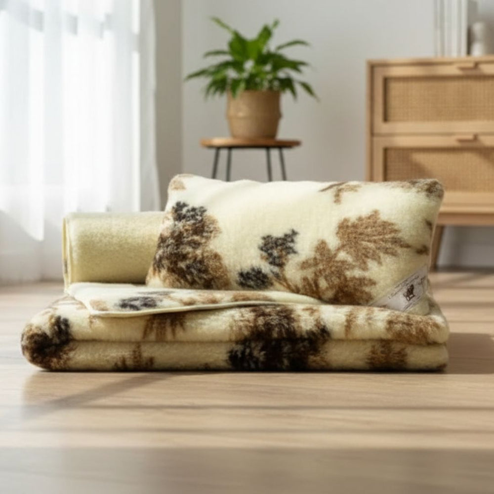 Prémium minőségű Merino gyapjú garnitúra. Ezt a szettet abszolút a vadon, az erdő inspirálta, a faágak finoman átszövik a takarókat és a párnát, így az anyatermészet lágy ölén érezheted magad a garnitúra ölelésében.