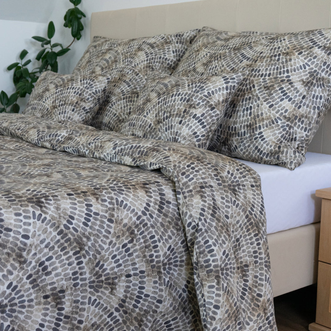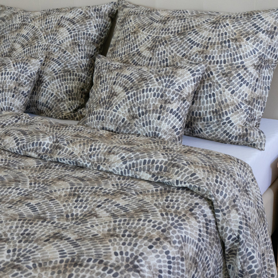 Prémium minőségű pamutszatén ágynemű garnitúra, amely elegáns földszíneivel és modern mintázatával bármilyen stílusú enteriőrbe illik. Kifinomult megjelenése és selymes tapintása a hálószobát igazi luxus hangulatú térré varázsolja.